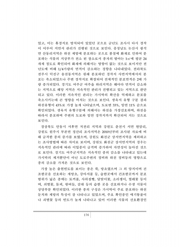 176 었고, 이는 휴경지로 방치되어 있었던 곳으로 금년도 조사시 다시 경작 이 이루어 지면서 관리가 진행된 것으로 보인다. 충청남도 논산시 광석 면 산동리지역은 하천 제방에 분포하는 곳으로 봄철에 화재로 인하여 분 포하는 식물의 지상부가 전소 된 장소로서 종자의 발아는 1㎡에 평균 24 개체 정도로 확인되어 화재에 의해서는 영향이 없는 것으로 보이지만 전 년도에 비해 1/4가량의 면적이 감소하는 경향을 나타내었다. 전라북도 전주시 덕진구 송천동지역은 원래 분포하던 경작지 사면지역에서의 분 포는 축소되었으나 주변 경작지로 확장되어 전체적인 분포면적은 2배 가 량 증가되었다. 경기도 여주군 여주읍 하리지역은 해마다 면적이 감소하 는 지역으로 해당 지역은 지속적인 관리가 진행되고 있는 지역으로 판단 되고 있다....