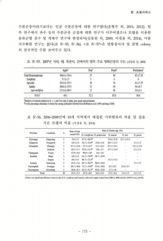 Ⅳ. 조절서비스 173 수분곤충이라기보다는 인공 수분곤충에 대한 연구였다 윤형주 외, 2011; 2012 일 부 연구에서 과수 등의 수분곤충 군집에 대한 연구가 이루어졌으나 트랩을 이용한 분류군별 종수 및 개체수 연구에 한정되어 김동원 외, 2009; 이경용 외, 2014 , 이를 지수화한 연구는 없다 표 Ⅳ 55, Ⅳ 56 표 Ⅳ 57 은 양봉종사자 및 꿀벌 colony 의 전국적인 수를 보여주고 있다. 표 Ⅳ-55. 2007년 사과, 배, 복숭아, 감에서의 벌목 주요 방화곤충의 수도 김동원 등, 2009 표 Ⅳ-56. 2006-2008년에 10개 지역에서 채집된 가위벌류의 비율 및 집을 지은 트랩의 비율 이경용 외, 2014