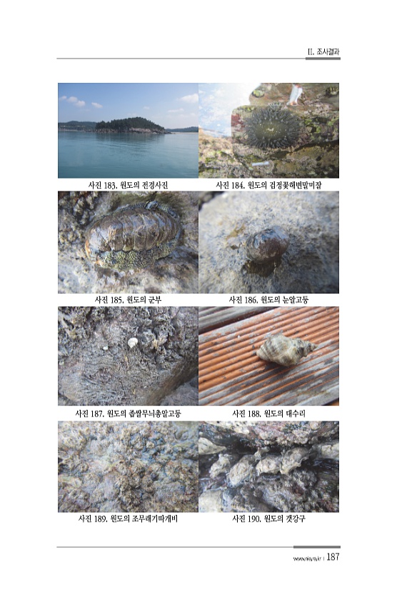 II. 조사결과 www.nie.re.kr ?187 사진 183. 원도의 전경사진 사진 184. 원도의 검정꽃해변말미잘 사진 185. 원도의 군부 사진 186. 원도의 눈알고둥 사진 187. 원도의 좁쌀무늬총알고둥 사진 188. 원도의 대수리 사진 189. 원도의 조무래기따개비 사진 190. 원도의갯강구