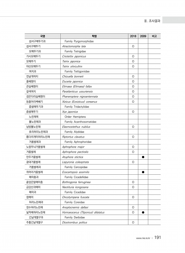 Ⅱ. 조사결과 www.nie.re.kr ? 191 국명 학명 2018 2009 비고 섬서구메뚜기과 Family Pyrgomorphidae 섬서구메뚜기 Atractomorpha lata O 모메뚜기과 Family Tetrigidae 가시모메뚜기 Criotettix japonicus O 모메뚜기 Tetrix japonica O 야산모메뚜기 Tetrix silvicultrix O 여치과 Family Tettigoniidae 잔날개여치 Chizuella bonneti O 줄베짱이 Ducetia japonica O 큰실베짱이 Elimaea Elimaea fallax O 갈색여치 Paratlanticus ussuriensis O 검은다리실베짱이 Phaneroptera nigroantennata O 등줄어리쌕쌔기 Xiz...