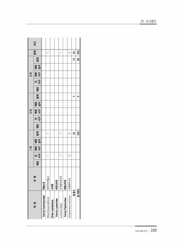 189 학 명 국 명 1 차 2 차 3 차 합계 비고 해빈 전 사구 배후 사구 배후 습지 합계 해빈 사구 전 배후 사구 배후 습지 합계 해빈 사구 전 배후 사구 배후 습지 합계 Family Cerambycidae 하늘소과 Moechotypa diphysis 털두꺼비하늘소 1 1 1 Order Lepidoptera 나비목 Family Lycaenidae 부전나비과 Lycaena dispar 큰주홍부전나비 1 1 1 Family Papilionidae 호랑나비과 Atrophaneura alcinous 사향제비나비 2 2 2 총 종수 32 7 15 52 총 개체수 326 9 68403