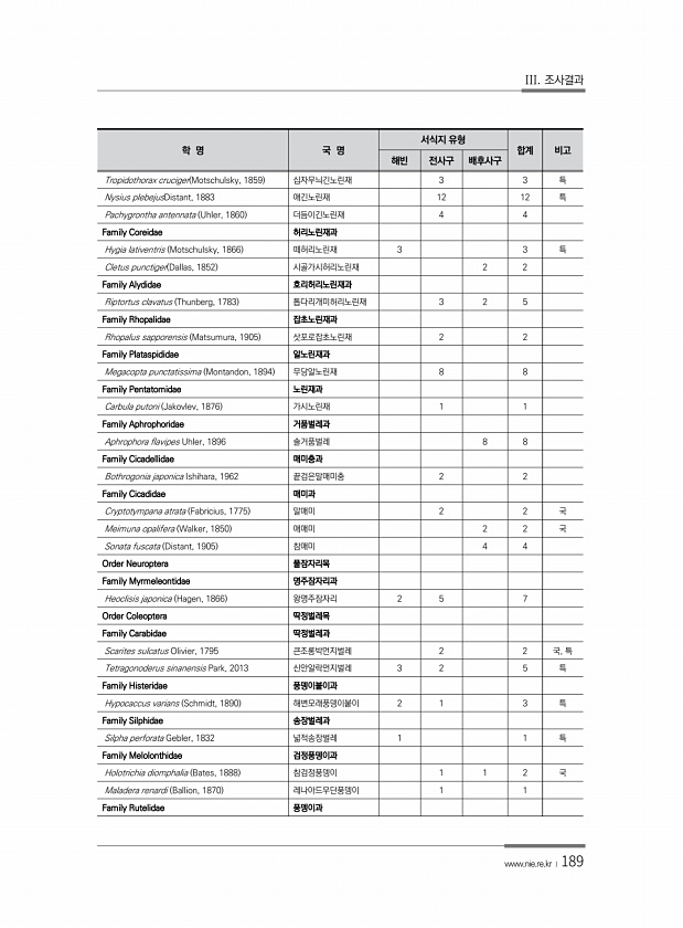 III. 조사결과 www.nie.re.kr ?189 학 명 국 명 서식지 유형 합계 비고 해빈 전사구 배후사구 Tropidothorax cruciger Motschulsky, 1859 십자무늬긴노린재 3 3 특 Nysius plebejusDistant, 1883 애긴노린재 12 12 특 Pachygrontha antennata Uhler, 1860 더듬이긴노린재 4 4 Family Coreidae 허리노린재과 Hygia lativentris Motschulsky, 1866 떼허리노린재 3 3 특 Cletus punctiger Dallas, 1852 시골가시허리노린재 2 2 Family Alydidae 호리허리노린재과 Riptortus clavatus Thunberg, 1783 톱다리개미허리노린재 3 2 5 ...