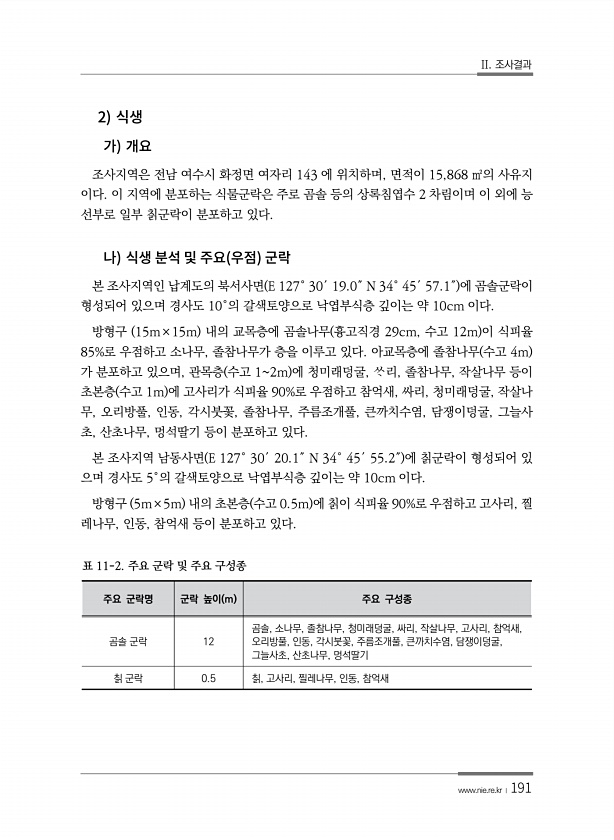 II. 조사결과 www.nie.re.kr ?191 2 조사지역은 전남 여수시 화정면 여자리 143 에 위치하며, 면적이 15,868 ㎡의 사유지 이다. 이 지역에 분포하는 식물군락은 주로 곰솔 등의 상록침엽수 2 차림이며 이 외에 능 선부로 일부 칡군락이 분포하고 있다. 본 조사지역인 납계도의 북서사면 E 127° 30′ 19.0″ N 34° 45′ 57.1″ 에 곰솔군락이 형성되어 있으며 경사도 10°의 갈색토양으로 낙엽부식층 깊이는 약 10cm 이다. 방형구 15m×15m 내의 교목층에 곰솔나무 흉고직경 29cm, 수고 12m 이 식피율 85%로 우점하고 소나무, 졸참나무가 층을 이루고 있다. 아교목층에 졸참나무 수고 4m 가 분포하고 있으며, 관목층 수고 12m 에 청미래덩굴, ?리, 졸참나무, 작살나...