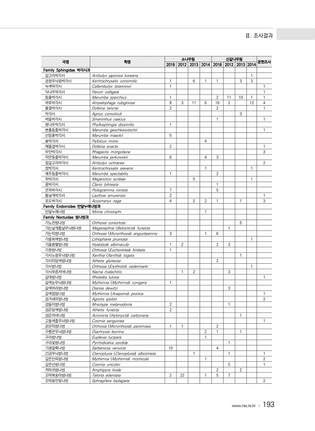 Ⅱ. 조사결과 www.nie.re.kr ? 193 국명 학명 소나무림 신갈나무림 문헌조사 2018 2012 2013 2014 2018 2012 2013 2014 Family Sphingidae 박각시과 갈고리박각시 Ambulyx japonica koreana 1 검정무늬점박각시 Kentrochrysalis consimilis 1 6 1 1 3 3 녹색박각시 Callambulyx tatarinovii 1 1 닥나무박각시 Parum colligata 1 등줄박각시 Marumba sperchius 1 2 11 19 1 1 머루박각시 Ampelophaga rubiginosa 8 3 11 6 16 2 12 4 물결박각시 Dolbina tancrei 2 2 1 박각시 Agrius convolvuli 3 버들박각시 Sm...