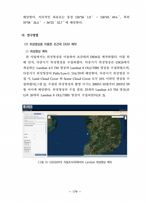 179 해당한다. 지리적인 좌표로는 동경 126°26′1.8″ 126°45′49.6″, 북위 35°58′24.4″ 36°23′32.7″에 해당한다. 다. 연구방법 1 위성영상을 이용한 조간대 DEM 제작 ① 위성영상 획득 본 사업에서는 위성영상을 이용하여 조간대의 DEM을 제작하였다. 이를 위 해 먼저, 다중시기 위성영상을 수집하였다. 다중시기 위성영상은 USGS에서 제공하는 Landsat 4-5 TM 영상과 Landsat 8 OLI/TIRS 영상을 수집하였으며, 다중시기 위성영상의 Path/Low는 116/35에 해당한다. 다중시기 위성영상 수 집 시, Land Cloud Cover 와 Scene Cloud Cover 모두 10% 이하인 영상을 수 집하였다 그림 2 수집된 위성영상의 촬영 시기는 2000년...