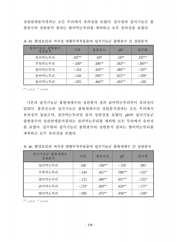 190 종수가 출현하였다. 습지의 특성으로 저서성대형무척추동물 중에서 가장 다양하게 출현하 는 수서곤충의 잠자리목, 딱정벌레목, 노린재목이 우점하는 것으로 나타났다. 하지만 2014 년도에서는 수서딱정벌레의 경우 초식성의 물땡땡이과 종류들이 다양하게 출현한 방면, 2019년에서는 초식성의 물땡땡이류의 다양도는 현저하게 줄어들고 육식성인 물방개류 종 류들의 다양성이 늘어난 것을 볼 수 있었다. 이는 습지내의 인위적인 먹이사슬로 인한 육 식성 생물들이 증가했다는 것을 나타낸다. 또한 습지내 먹이원인 식생들이 수위변화로 인 해 천이과정에서 나타나는 하나의 원인으로 파악된다. 생물군집의 변화는 일반적으로 서식 처의 변화 및 먹이 자원의 변화에 따라 달라진다. 정기적인 모니터링을 통해 군집 변화의 추이를 관찰해야 할...
