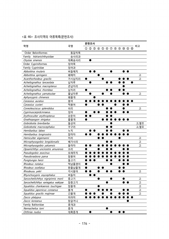 176 학명 국명 문헌조사 비고 ① ② ③ ④ ⑤ ⑥ ⑦ ⑧ ⑨ ⑩ ⑪ ⑫ Order Beloniformes 동갈치목 Family Adrianichthyoidae 송사리과 Oryzias sinensis 대륙송사리 ● Order Cypriniformes 잉어목 Family Cyprinidae 잉어과 Abbottina rivularis 버들매치 ● ● ● ● ● Abbottina springero 왜매치 ● 고 Acanthorhodeus gracilis 가시납지리 ● ● ● ● ● 고 Acheilognathus lanceolata 납자루 ● ● ● ● ● ● Acheilognathus macropterus 큰...