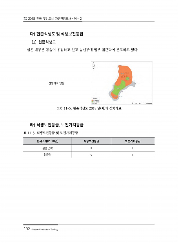 2018 전국 무인도서 자연환경조사 여수 2 192 ? National Institute of Ecology 1 섬은 대부분 곰솔이 우점하고 있고 능선부에 일부 칡군락이 분포하고 있다. 선행자료 없음 그림 11-5. 현존식생도 2018 년 좌 과 선행자료 , 현재조사 2018년 식생보전등급 보전가치등급 곰솔군락 Ⅲ Ⅱ 칡군락 Ⅴ Ⅱ 표 11-3. 식생보전등급 및보전가치등급
