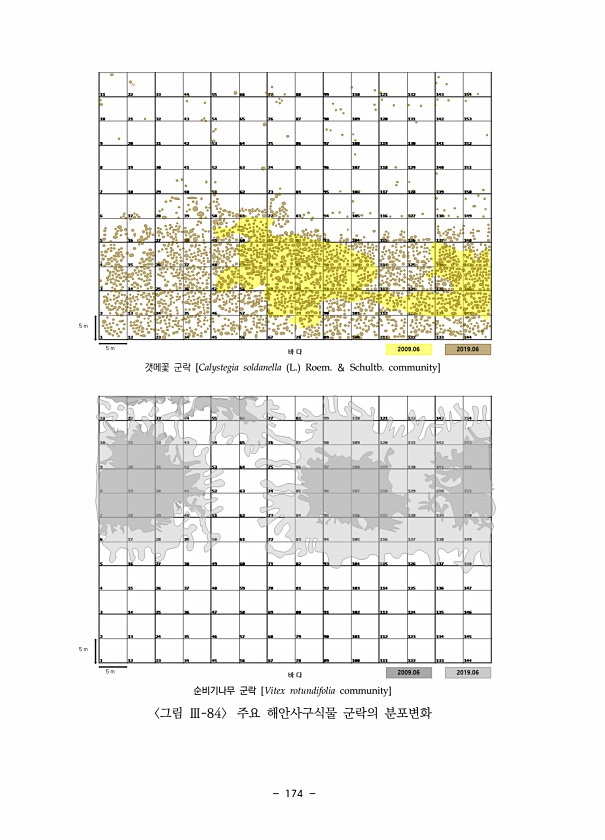 174 갯메꽃 군락 [Calystegia soldanella L. Roem. & Schultb. community] 순비기나무 군락 [Vitex rotundifolia community] 그림 Ⅲ-84 주요 해안사구식물 군락의분포변화