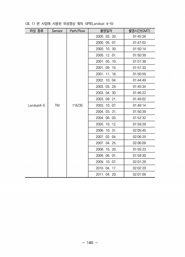180 위성 종류 Sensor Path/Row 촬영일자 촬영시간 GMT Landsat4-5 TM 116/35 2000. 03. 20. 014526 2000. 05. 07. 014702 2000. 10. 30. 015014 2000. 12. 01. 015039 2001. 05. 10. 015138 2001. 09. 15. 015133 2001. 11. 18. 015059 2002. 10. 04. 014449 2003. 03. 29. 014534 2003. 04. 30. 014622 2003. 09. 21. 014902 2003. 10. 07. 014914 2004. 03. 31. 015039 2004. 06. 03. 015232 2005. 10. 12. 015928 2006. 10. 31. 020545 200...