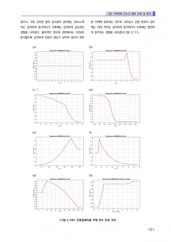 3장 기후변화 리스크 항목 선정 및 평가 181 았으나, 가장 건조한 달의 강수량의 경우에는 20mm까 지는 급격하게 증가하다가 이후에는 급격하게 감소하는 경향을 나타냈다. 물리적인 변수와 관련해서는 DEM은 증가할수록 급격하게 반응의 정도가 낮아져 경사가 완만 한 지역에 분포하는 것으로 나타났고 산림 분포의 경우 에는 18% 까지는 급격하게 증가하다가 이후에는 완만하 게 증가하는 경향을 나타냈다 그림 3.111 a b c d e f g h 그림 3.106 단풍잎돼지풀 모형 변수 반응곡선