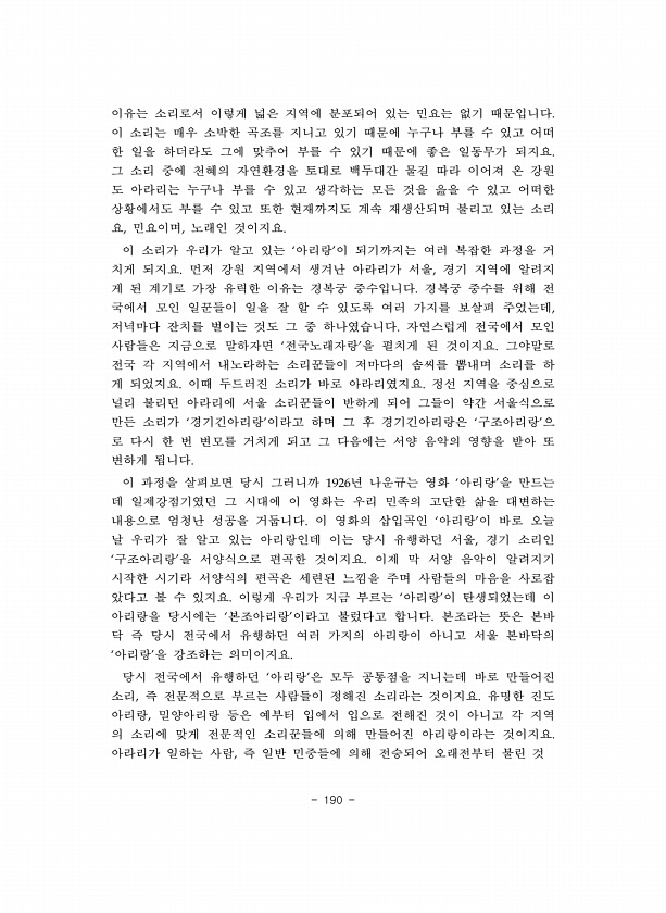 190 이유는 소리로서 이렇게 넓은 지역에 분포되어 있는 민요는 없기 때문입니다 이 소리는 매우 소박한 곡조를 지니고 있기 때문에 누구나 부를 수 있고 어떠 한 일을 하더라도 그에 맞추어 부를 수 있기 때문에 좋은 일동무가 되지요 그 소리 중에 천혜의 자연환경을 토대로 백두대간 물길 따라 이어져 온 강원 도 아라리는 누구나 부를 수 있고 생각하는 모든 것을 읊을 수 있고 어떠한 상황에서도 부를 수 있고 또한 현재까지도 계속 재생산되며 불리고 있는 소리 요 민요이며 노래인 것이지요 이 소리가 우리가 알고 있는 아리랑 이 되기까지는 여러 복잡한 과정을 거 치게 되지요 먼저 강원 지역에서 생겨난 아라리가 서울 경기 지역에 알려지 게 된 계기로 가장 유력한 이유는 경복궁 중수입니다 경복궁 중수를 위해 전 국에서 모...