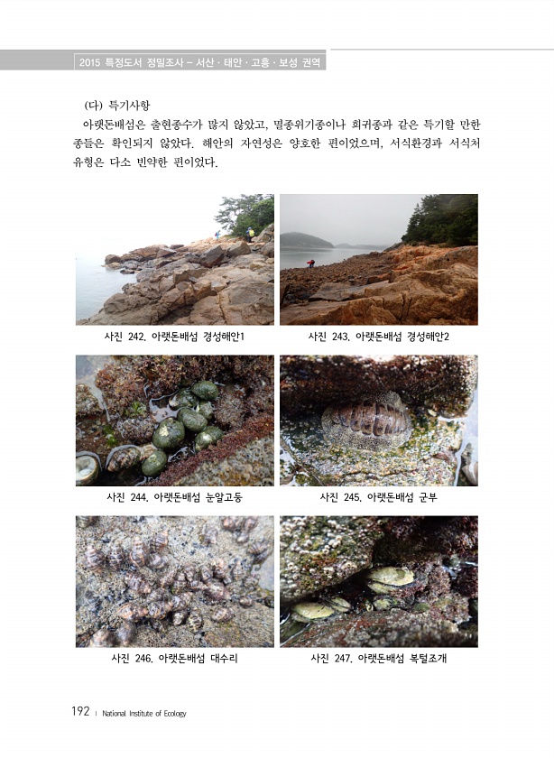 2015 특정도서 정밀조사 서산·태안·고흥·보성 권역 192 ? National Institute of Ecology 다 특기사항 아랫돈배섬은 출현종수가 많지 않았고, 멸종위기종이나 희귀종과 같은 특기할 만한 종들은 확인되지 않았다. 해안의 자연성은 양호한 편이었으며, 서식환경과 서식처 유형은 다소 빈약한 편이었다. 사진 242. 아랫돈배섬 경성해안1 사진 243. 아랫돈배섬 경성해안2 사진 244. 아랫돈배섬 눈알고둥 사진 245. 아랫돈배섬 군부 사진 246. 아랫돈배섬 대수리 사진 247. 아랫돈배섬복털조개