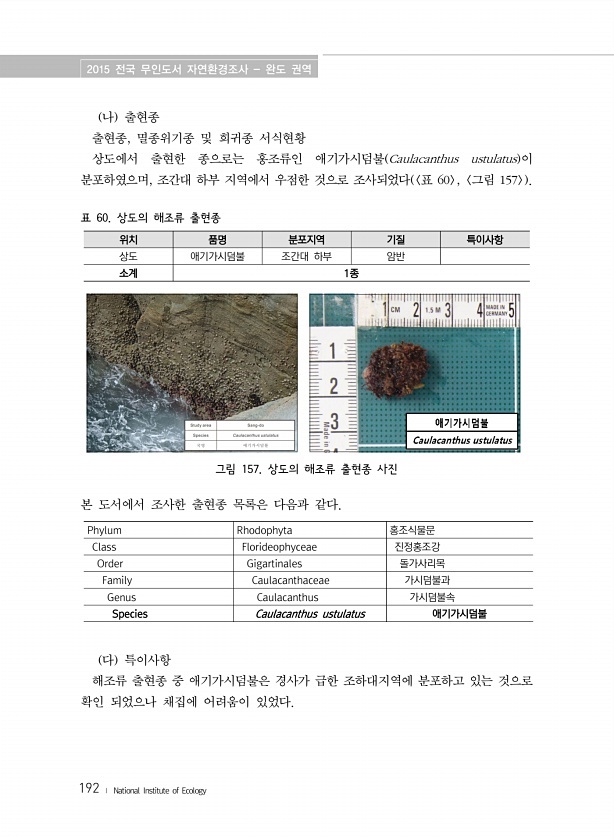 2015 전국 무인도서 자연환경조사 완도 권역 192 ? National Institute of Ecology 나 출현종 출현종, 멸종위기종 및 희귀종 서식현황 상도에서 출현한 종으로는 홍조류인 애기가시덤불 Caulacanthus ustulatus 이 분포하였으며, 조간대 하부 지역에서 우점한 것으로 조사되었다 표 60 , 그림 157 표 60. 상도의 해조류 출현종 위치 품명 분포지역 기질 특이사항 상도 애기가시덤불 조간대 하부 암반 소계 1종 그림 157. 상도의 해조류 출현종 사진 본 도서에서 조사한 출현종 목록은 다음과 같다. Phylum Rhodophyta 홍조식물문 Class Florideophyceae 진정홍조강 Order Gigartinales 돌가사리목 Family Caulacanthacea...