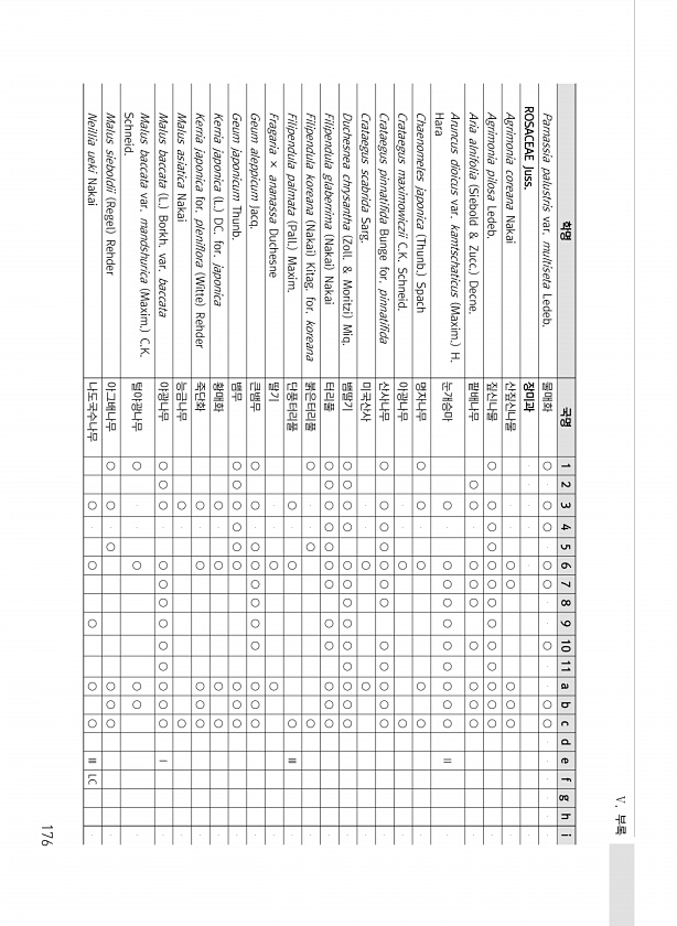 Ⅴ. 부록 176 학명 국명 1 2 3 4 5 6 7 8 9 10 11 a b c d e f g h i Parnassia palustris var. multiseta Ledeb. 물매화 ○ ○ ○ ○ ○ ○ ○ ○ ROSACEAE Juss. 장미과 Agrimonia coreana Nakai 산짚신나물 ○ ○ ○ ○ ○ Agrimonia pilosa Ledeb. 짚신나물 ○ ○ ○ ○ ○ ○ ○ ○ ○ ○ ○ ○ ○ Aria alnifolia Siebold & Zucc. Decne. 팥배나무 ○ ○ ○ ○ ○ ○ ○ ○ ○ Aruncus dioicus var. kamtschaticus Maxim. H. Hara 눈개승마 ○ ○ ○ ○ ○ ○ ○ ○ ○ ○ Ⅱ Chaenomeles japonica Thunb. ...