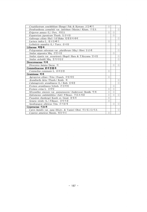 187 Crepidiastrum sonchifolium Bunge Pak & Kawano 고들빼기 ○ Dendranthema zawadskii var. latilobum Maxim. Kitam. 구절초 ○ Erigeron annuus L. Pers. 개망초 ○ ○ Eupatorium japonicum Thunb. 등골나물 ○ Galinsoga ciliata Raf. S.F.Blake 털별꽃아재비 ○ Lactuca indica L. 왕고들빼기 ○ Leibnitzia anandria L. Turcz. 솜나물 ○ Liliaceae 백합과 Polygonatum odoratum var. pluriflorum Miq. Ohwi 둥굴레 ○ Smilax nipponica Miq. 선밀나물 ○ Smilax riparia v...