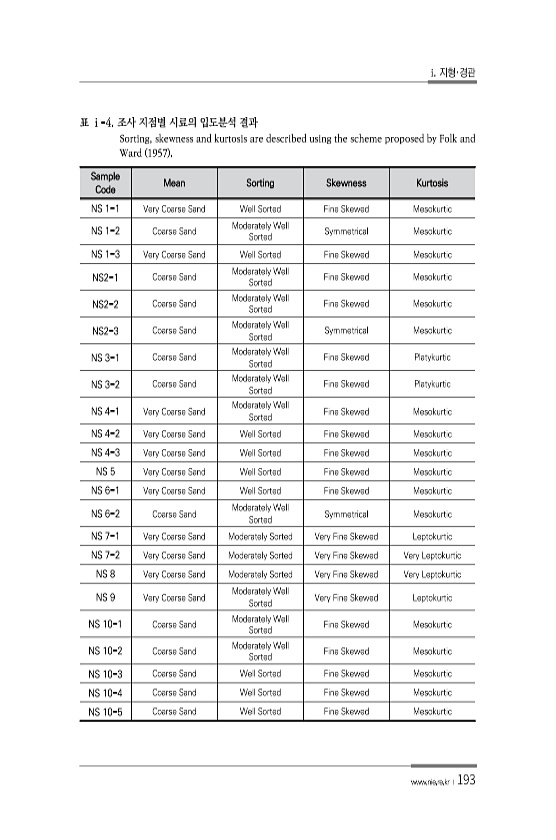 i. 지형·경관 www.nie.re.kr ?193 Sample Code Mean Sorting Skewness Kurtosis NS 1-1 Very Coarse Sand Well Sorted Fine Skewed Mesokurtic NS 1-2 Coarse Sand Moderately Well Sorted Symmetrical Mesokurtic NS 1-3 Very Coarse Sand Well Sorted Fine Skewed Mesokurtic NS2-1 Coarse Sand Moderately Well Sorted Fine Skewed Mesokurtic NS2-2 Coarse Sand Moderately Well Sorted Fine Skewed Mesokurtic NS2-3 Coarse Sand ...
