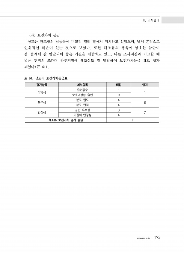 Ⅱ. 조사결과 www.nie.re.kr ? 193 라 보전가치 등급 상도는 완도항의 남동쪽에 비교적 멀리 떨어져 위치하고 있었으며, 낚시 흔적으로 인위적인 훼손이 있는 것으로 보였다. 또한 해조류의 생육에 양호한 암반이 섬 둘레에 잘 발달되어 좋은 기질을 제공하고 있고, 다른 조사지점과 비교할 때 넓은 면적의 조간대 하부지점에 해조상도 잘 발달하여 보전가치등급 Ⅱ로 평가 되었다 표 61 표 61. 상도의 보전가치등급표 평가항목 세부항목 배점 합계 다양성 출현종수 1 1 보호대상종 출현 0 풍부성 분포 밀도 4 8 분포 면적 4 안정성 경관 우수성 3 7 기질의 안정성 4 해조류 보전가치 평가 등급Ⅱ