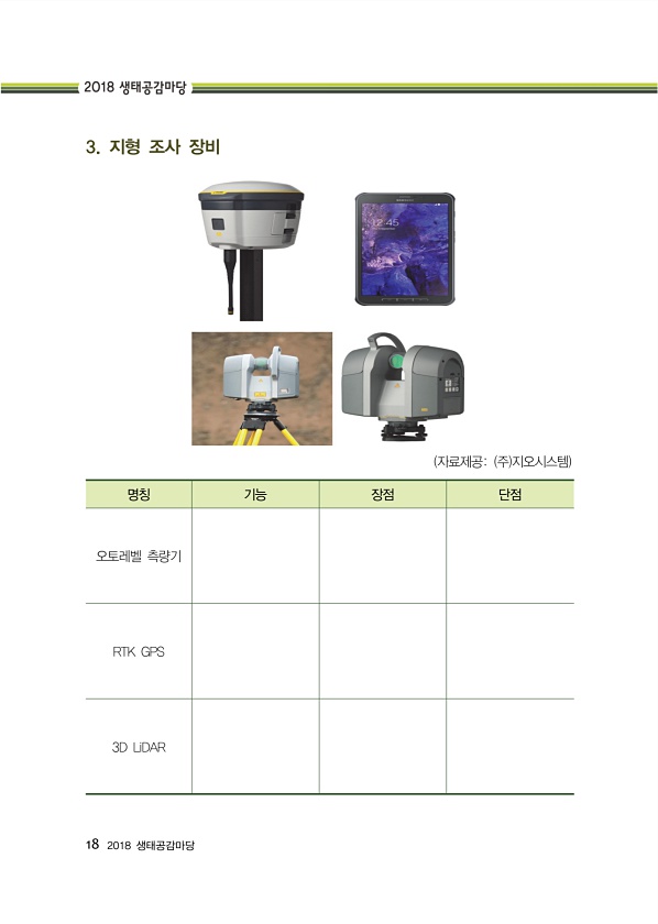 18 2018 생태공감마당 3. 지형 조사 장비 자료제공주 지오시스템 명칭 기능 장점 단점 오토레벨 측량기 RTK GPS 3DLiDAR