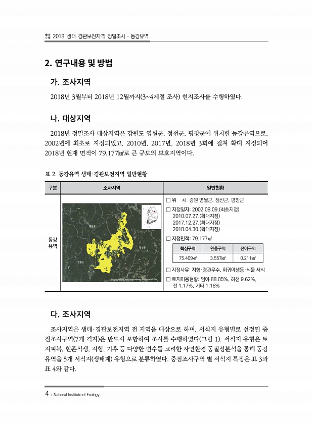 2018 생태·경관보전지역 정밀조사 동강유역 4 ? National Institute of Ecology 2. 2018년 3월부터 2018년 12월까지 34계절 조사 현지조사를 수행하였다. 2018년 정밀조사 대상지역은 강원도 영월군, 정선군, 평창군에 위치한 동강유역으로, 2002년에 최초로 지정되었고, 2010년, 2017년, 2018년 3회에 걸쳐 확대 지정되어 2018년 현재 면적이 79.177㎢로 큰 규모의 보호지역이다. 구분 조사지역 일반현황 동강 유역 □ 위 치강원 영월군, 정선군, 평창군 □ 지정일자2002.08.09. 최초지정 2010.07.27. 확대지정 2017.12.27. 확대지정 2018.04.30. 확대지정 □ 지정면적79.177㎢ 핵심구역 완충구역 전이구역 75.409㎢ 3.557...