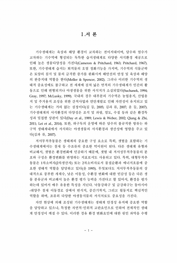 1 Ⅰ.서 론 기수생태계는 육상과 해양 환경이 교차하는 전이지대이며, 담수와 염수가 교차하는 기수역에 형성되는 독특한 습지생태계로 다양한 서식환경 제공으로 인해 높은 생물다양성을 가진다 Cameron & Pritchard, 1963; Pritchard, 1967 또한, 기수생태계 습지는 퇴적물의 오염 정화기능을 가지며, 기수역의 식물군락 은 토양의 침식 및 물의 급격한 증가를 완화시켜 해안선의 안정 및 육상과 해양 의 완충지대 역할을 한다 Moller & Spencer, 2002 그러나 이러한 기수역의 생 태적 중요성에도 불구하고 전 세계에 걸쳐 넓은 면적의 기수생태계가 인간의 활 동으로 인해 변형되거나 야생생물을 위한 서식지가 소실되었다 Suchanek, 1994; Gray, 1997; McLusky, 1...