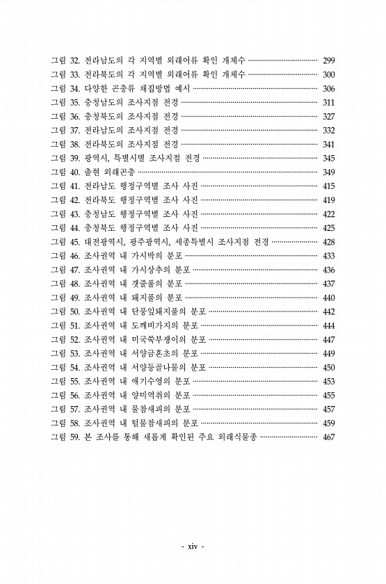 xiv 그림 32. 전라남도의 각 지역별 외래어류 확인 개체수 ··································· 299 그림 33. 전라북도의 각 지역별 외래어류 확인 개체수 ··································· 300 그림 34. 다양한 곤충류 채집방법 예시 ······························································· 306 그림 35. 충청남도의 조사지점 전경 ····································································· 311 그림 36. 충청북도의 조사지점 전경 ···············································...