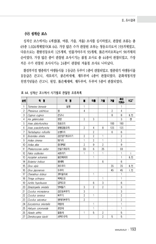 Ⅱ. 조사결과 www.nie.re.kr ? 193 순번 학 명 국 명 봄 여름 가을 겨울 최대 개체수 비고° 1 Tetrastes bonasia 들꿩 1 1 2 Phasianus colchicus 꿩 4 2 4 3 Cygnus cygnus 큰고니 8 8 Ⅱ,천 4 Aix galericulata 원앙 2 3 3 천 5 Anas platyrhynchos 청둥오리 193 193 6 Anas poecilorhyncha 흰뺨검둥오리 2 4 8 125 125 7 Tachybaptus ruficollis 논병아리 2 6 6 8 Butorides striata 검은댕기해오라기 2 2 1 2 9 Ardea cinerea 왜가리 1 2 1 2 10 A...