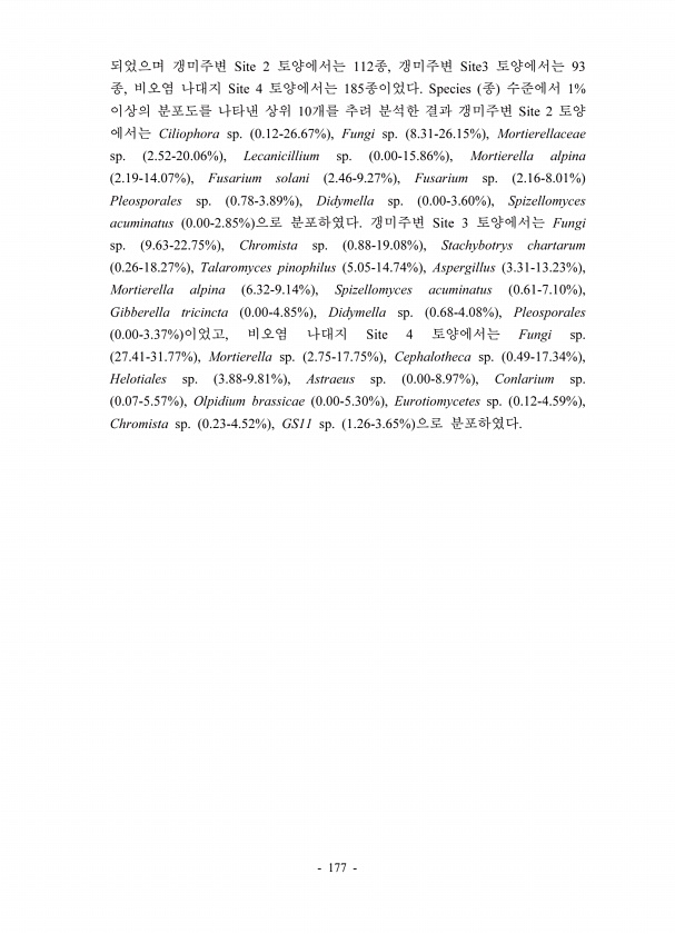 177 Site 2 112 , Site3 93 , Site 4 185 Species 1% 10 Site 2 Ciliophora sp. 0.12-26.67% , Fungi sp. 8.31-26.15% , Mortierellaceae sp. 2.52-20.06% , Lecanicillium sp. 0.00-15.86% , Mortierella alpina 2.19-14.07% , Fusarium solani 2.46-9.27% , Fusarium sp. 2.16-8.01% Pleosporales sp. 0.78-3.89% , Didymella sp. 0.00-3.60% , Spizellomyces acuminatus 0.00-2.85% Site 3 Fungi sp. 9.63-22.75% , Chromista s...