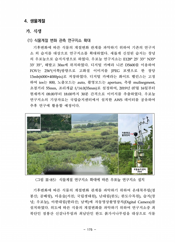 175 4. 생물계절 가. 식생 1 식물계절 변화 관측 연구지소 확대 기후변화에 따른 식물의 계절변화 관계를 파악하기 위하여 기존의 연구지 소 외 습지를 대상으로 연구지소를 확대하였다. 새롭게 신설된 습지는 창녕 의 우포늪으로 습지식생으로 하였다. 우포늪 연구지소는 E128° 25‘ 33‘‘ N35° 33‘ 35‘‘, 해발고 30m에 위치하였다. 디지털 카메라 니콘 D5600를 이용하여 FOV는 256° 서쪽 방향으로 고화질 이미지를 JPEG 포맷으로 한 장당 13mb 6000×4000pix 로 저장하였다. 디지털 카메라는 화이트 벨런스는 고정 하여 ios는 800, 노출모드는 auto, 촬영모드는 aperture, 측광 mulisegment, 초점거리 55mm, 조리개값 f/14.0 35mm 로 설정하여,...