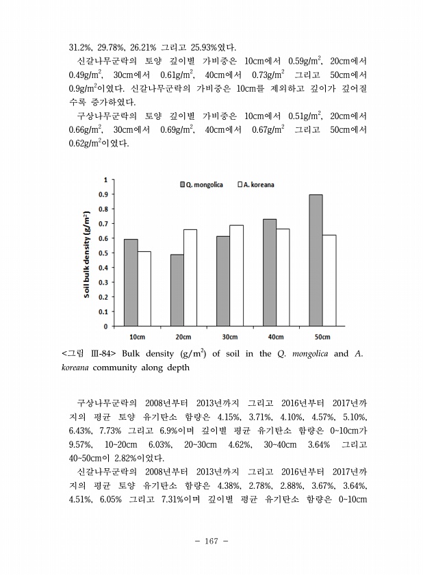 167 31.2%, 29.78%, 26.21% 그리고 25.93%였다. 신갈나무군락의 토양 깊이별 가비중은 10cm에서 0.59g/m2, 20cm에서 0.49g/m2, 30cm에서 0.61g/m2, 40cm에서 0.73g/m2 그리고 50cm에서 0.9g/m2이였다. 신갈나무군락의 가비중은 10cm를 제외하고 깊이가 깊어질 수록 증가하였다. 구상나무군락의 토양 깊이별 가비중은 10cm에서 0.51g/m2, 20cm에서 0.66g/m2, 30cm에서 0.69g/m2, 40cm에서 0.67g/m2 그리고 50cm에서 0.62g/m2이였다. 그림 Ⅲ-84 Bulk density g/m2 of soil in the Q. mongolica and A. koreana community along depth 구상나무군락...