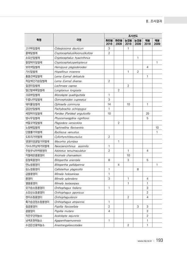 Ⅱ. 조사결과 www.nie.re.kr ? 193 학명 국명 조사년도 화란봉 2018 화란봉 2009 능경봉 2018 능경봉 2009 매봉 2018 매봉 2009 고구마잎벌레 Colasposoma dauricum 3 1 콜체잎벌레 Cryptocephalus Asionus koltzei 2 소요산잎벌레 Cryptocephalus hyacinthinus 1 팔점박이잎벌레 Cryptocephaluspeliopterus 1 보라색잎벌레 Hemipyxis plagioderoides 4 가시잎벌레 Hispellinus moerens 1 2 홍줄큰벼잎벌레 Lema Lema delicatula 1 적갈색긴가슴잎벌레 Lema Lema diversa 2 질경이잎벌레 Lochmaea caprea 2 털긴발벼룩잎벌레 Longit...