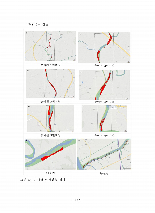 177 다 면적 산출 송야천 1번지점 송야천 2번지점 송야천 3번지점 송야천 4번지점 송야천 5번지점 송야천 6번지점 내성천 논산천 그림 66. 가시박 면적산출결과