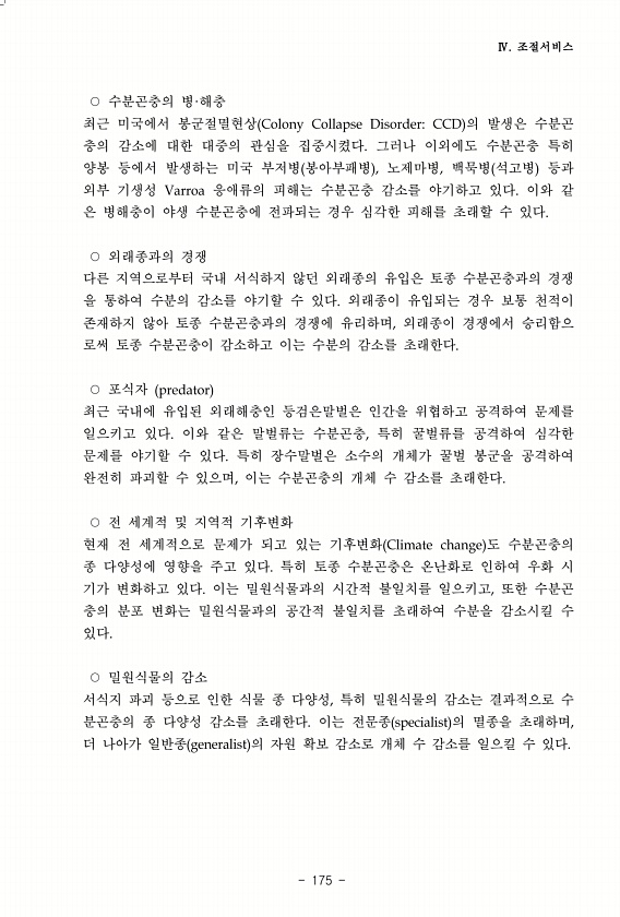 Ⅳ. 조절서비스 175 ○ 수분곤충의 병·해충 최근 미국에서 봉군절멸현상 Colony Collapse DisorderCCD 의 발생은 수분곤 충의 감소에 대한 대중의 관심을 집중시켰다. 그러나 이외에도 수분곤충 특히 양봉 등에서 발생하는 미국 부저병 봉아부패병 , 노제마병, 백묵병 석고병 등과 외부 기생성 Varroa 응애류의 피해는 수분곤충 감소를 야기하고 있다. 이와 같 은 병해충이 야생 수분곤충에 전파되는 경우 심각한 피해를 초래할 수 있다. ○ 외래종과의 경쟁 다른 지역으로부터 국내 서식하지 않던 외래종의 유입은 토종 수분곤충과의 경쟁 을 통하여 수분의 감소를 야기할 수 있다. 외래종이 유입되는 경우 보통 천적이 존재하지 않아 토종 수분곤충과의 경쟁에 유리하며, 외래종이 경쟁에서 승리함으 로써 토종 ...