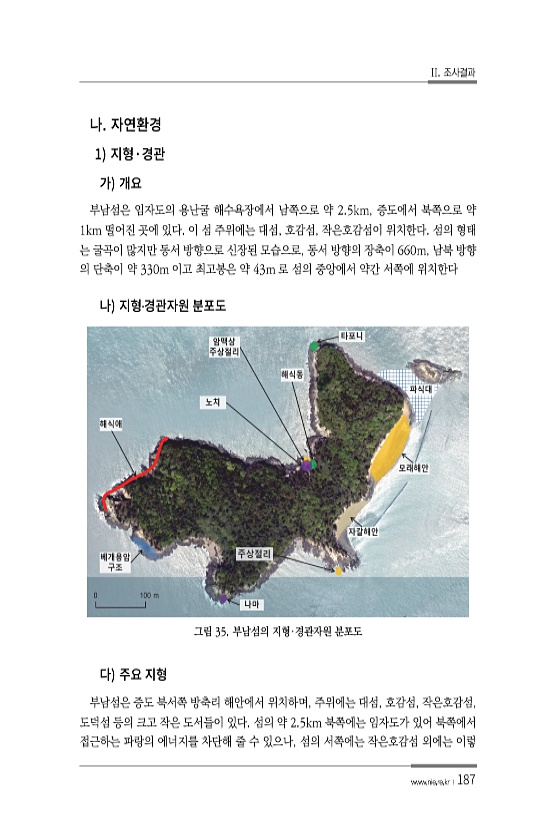 II. 조사결과 www.nie.re.kr ?187 1 · 부남섬은 임자도의 용난굴 해수욕장에서 남쪽으로 약 2.5km, 증도에서 북쪽으로 약 1km 떨어진 곳에 있다. 이 섬 주위에는 대섬, 호감섬, 작은호감섬이 위치한다. 섬의 형태 는 굴곡이 많지만 동서 방향으로 신장된 모습으로, 동서 방향의 장축이 660m, 남북 방향 의 단축이 약 330m 이고 최고봉은 약 43m 로 섬의 중앙에서 약간 서쪽에 위치한다 ? 그림 35. 부남섬의 지형·경관자원 분포도 부남섬은 증도 북서쪽 방축리 해안에서 위치하며, 주위에는 대섬, 호감섬, 작은호감섬, 도덕섬 등의 크고 작은 도서들이 있다. 섬의 약 2.5km 북쪽에는 임자도가 있어 북쪽에서 접근하는 파랑의 에너지를 차단해 줄 수 있으나, 섬의 서쪽에는 작은호감섬 외에는...