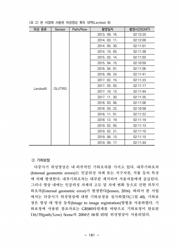 181 위성 종류 Sensor Path/Row 촬영일자 촬영시간 GMT Landsat8 OLI/TIRS 2013. 09. 16. 021325 2014. 03. 11. 021200 2014. 05. 30. 021101 2014. 10. 05. 021138 2015. 03. 14. 021103 2015. 04. 15. 021050 2016. 04. 01. 021106 2016. 09. 24. 021141 2017. 02. 15. 021123 2017. 03. 03. 021117 2017. 10. 13. 021144 2017. 11. 30. 021135 2018. 03. 06. 021106 2018. 03. 22. 021058 2018. 11. 01. 021122 2018. 12. 19. 021119 2019. ...