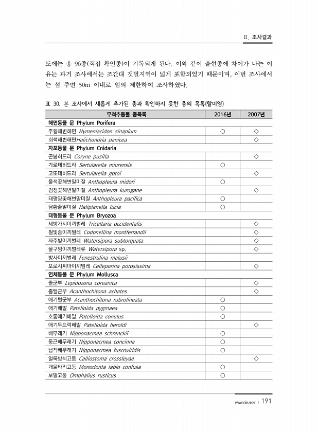 Ⅱ. 조사결과 www.nie.re.kr ? 191 무척추동물 종목록 2016년 2007년 해면동물 문 Phylum Porifera 주황해변해면 Hymeniacidon sinapium ○ ◇ 회색해변해면Halichondria panicea ◇ 자포동물 문 Phylum Cnidaria 곤봉히드라 Coryne pusilla ◇ 가로테히드라 Sertularella miurensis ○ 고또테히드라 Sertularella gotoi ◇ 풀색꽃해변말미잘 Anthopleura midori ○ 검정꽃해변말미잘 Anthopleura kurogane ◇ 태평양꽃해변말미잘 Anthopleura pacifica ○ 담황줄말미잘 Haliplanella lucia ○ 태형동물 문 Phylum Bryozoa 세방가시이끼벌레 Trice...