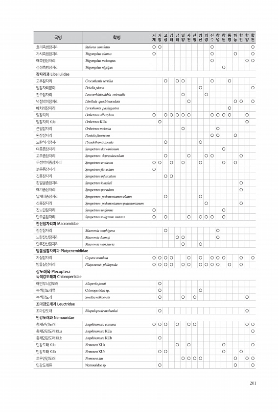 201 호리측범잠자리 Stylurus annulatus ○ ○ ○ ○ 가시측범잠자리 Trigomphus citimus ○ ○ ○ ○ 애측범잠자리 Trigomphus melampus ○ ○ ○ 검정측범잠자리 Trigomphus nigripes ○ 잠자리과 Libellulidae 고추잠자리 Crocothemis servilia ○ ○ ○ ○ ○ 밀잠자리붙이 Deielia phaon ○ ○ 진주잠자리 Leucorrhinia dubia orientalis ○ ○ 넉점박이잠자리 Libellula quadrimaculata ○ ○ ○ ○ 배치레잠자리 Lyriothemis pachygastra ○ 밀잠자리 Orthetrum albistylum ○ ○ ○ ○ ○ ○ ○ ○ ○ ○ ○ 밀잠자리 KUa Orthetrum KU...