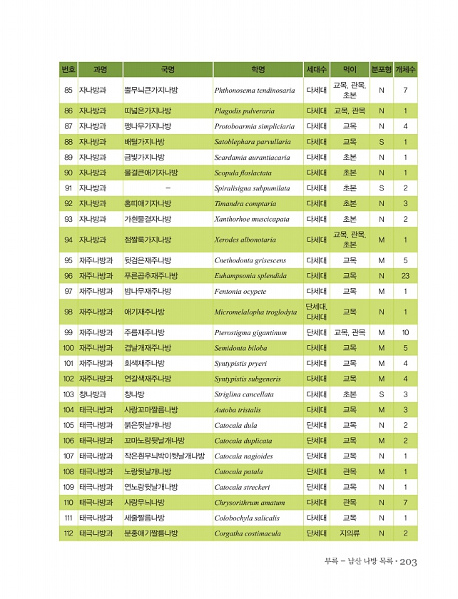 부록 남산 나방 목록?203 번호 과명 국명 학명 세대수 먹이 분포형 개체수 85 자나방과 뿔무늬큰가지나방 Phthonosema tendinosaria 다세대 교목, 관목, 초본 N 7 86 자나방과 띠넓은가지나방 Plagodis pulveraria 다세대 교목, 관목 N 1 87 자나방과 팽나무가지나방 Protoboarmia simpliciaria 다세대 교목 N 4 88 자나방과 배털가지나방 Satoblephara parvullaria 다세대 교목 S 1 89 자나방과 금빛가지나방 Scardamia aurantiacaria 다세대 초본 N 1 90 자나방과 물결큰애기자나방 Scopula foslactata 다세대 초본 N 1 91 자나방과 Spiralisigna subpumilata 다세대 초본 S 2 ...