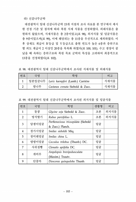 라 신갈나무군락 대전광역시 일대 신갈나무군락 15개 지점의 조사 자료를 본 연구에서 제시 한 선정 기준 및 절차에 따라 복원 식재 식물을 선정하였다. 외래식물은 출 현하지 않았으며, 식재식물은 총 2종이었고 표 98 , 외지식물 및 덩굴식물은 총 9종이었으며 표 99 , 이에 해당되는 총 11종을 우선적으로 제외하였다. 이 후 상재도 계급이 Ⅳ등급 및 Ⅴ등급으로 출현 빈도가 높은 6종과 층위구조 별 피도 계급이 2 이상인 20종을 목록화 하였다 표 100, 101 수고 생장이 끝 났을 때 속하는 층위구조와 복원 목표 군락의 특성을 고려하여 최종적으로 13종을 선정하였다 표 102 번호 국명 학명 비고 1 일본잎갈나무 Larix kaempferi Lamb. Carri?re 식재식물 2 밤나무 Castanea ...