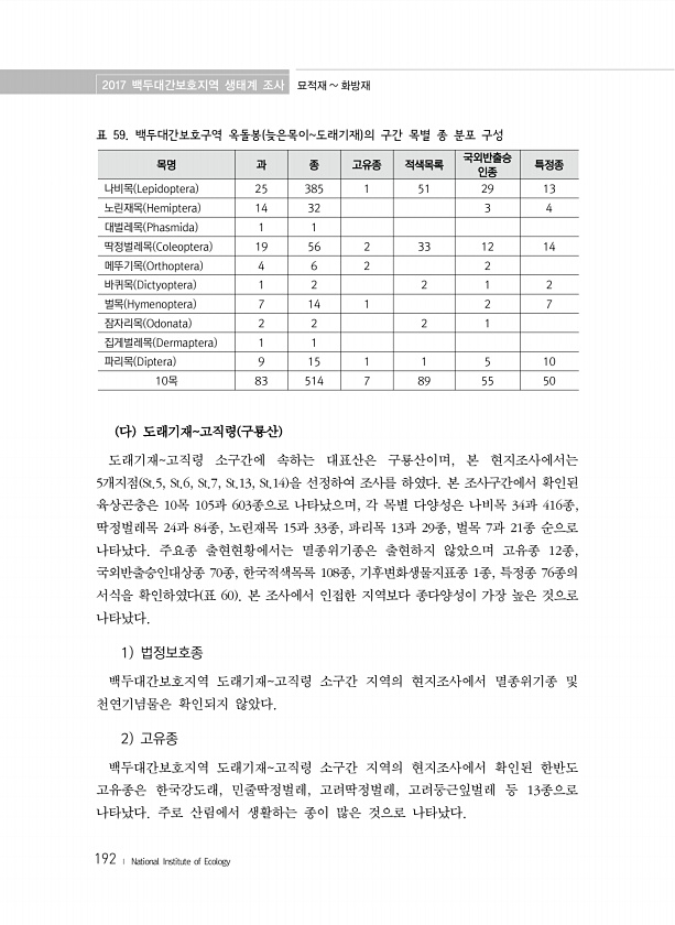 2017 백두대간보호지역 생태계 조사 묘적재 화방재 192 ? National Institute of Ecology 표 59. 백두대간보호구역 옥돌봉 늦은목이도래기재 의 구간 목별 종 분포 구성 목명 과 종 고유종 적색목록 국외반출승 인종 특정종 나비목 Lepidoptera 25 385 1 51 29 13 노린재목 Hemiptera 14 32 3 4 대벌레목 Phasmida 1 1 딱정벌레목 Coleoptera 19 56 2 33 12 14 메뚜기목 Orthoptera 4 6 2 2 바퀴목 Dictyoptera 1 2 2 1 2 벌목 Hymenoptera 7 14 1 2 7 잠자리목 Odonata 2 2 2 1 집게벌레목 Dermaptera 1 1 파리목 Diptera 9 15 1 1 5 10 10목 83 ...