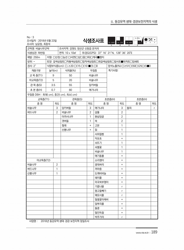 ii. 동강유역 생태·경관보전지역의 식생 www.nie.re.kr ?189 No 3 조사일자 2018년 6월 23일 조사자남궁정, 최중석 식생조사표 군락명비술나무군락 조사지역강원도 정선군 신동읍 운치리 식생상관하반림 면적10 x 10㎡ 위?경도 GPS 37° 16′ 21″N, 128° 36′ 20E 해발250m 지형□산정 □능선 □사면 □상□중□하 □계곡■평지 방위토양갈색삼림토□적황색삼림토□암적색삼림토□회갈색삼림토□침식토■퇴적토□암쇄토 경사2° 낙엽부식층 cm □.≥20 □ 15 □ 10 ■ 5 □0 암석노출 % □≥51□ 50□ 25□ 5■0 계층구분 높이 m 식피율 % 우점종 특기사항교 목 층 T1 9 50 비술나무 아교목층 T2 5 20 비술나무 관 목 층 S 3.5 55 당키버들 초 본 층 H 0.7...