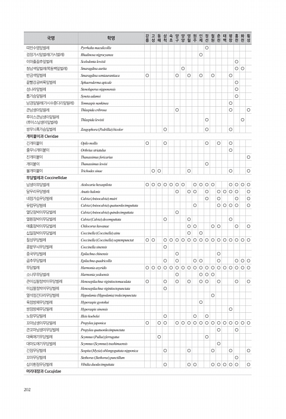 202 띠띤수염잎벌레 Pyrrhalta maculicollis ○ 검정가시잎벌레 가시벌레 Rhadinosa nigrocyanea ○ 이마줄꼽추잎벌레 Scelodonta lewisii ○ 청남색잎벌레 쪽동백잎벌레 Smaragdina aurita ○ ○ ○ 반금색잎벌레 Smaragdina semiaurantiaca ○ ○ ○ ○ ○ ○ 끝빨강공벼룩잎벌레 Sphaeroderma apicale ○ 섬나라잎벌레 Stenoluperus nipponensis ○ 톱가슴잎벌레 Syneta adamsi ○ 남경잎벌레 가시수중다리잎벌레 Temnaspis nankinea ○ 큰남생이잎벌레 Thlaspida cribrosa ○ ○ ○ 루이스큰남생이잎벌레 루이스남생이잎벌레 Thlaspida lewisii ○ ○ 쌍무늬혹가슴잎벌레 ...