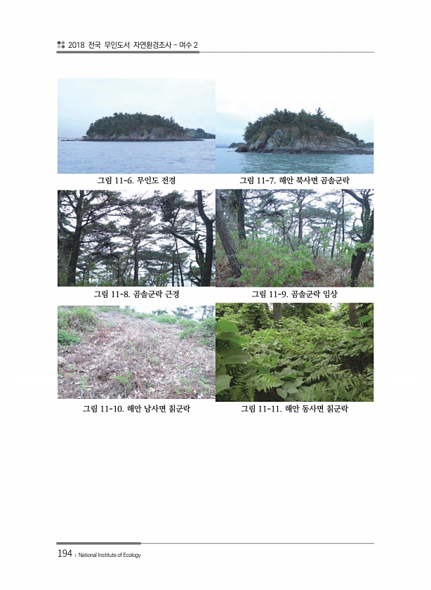 2018 전국 무인도서 자연환경조사 여수 2 194 ? National Institute of Ecology 그림 11-6. 무인도 전경 그림 11-7. 해안 북사면 곰솔군락 그림 11-8. 곰솔군락 근경 그림 11-9. 곰솔군락 임상 그림 11-10. 해안 남사면 칡군락 그림 11-11. 해안 동사면칡군락