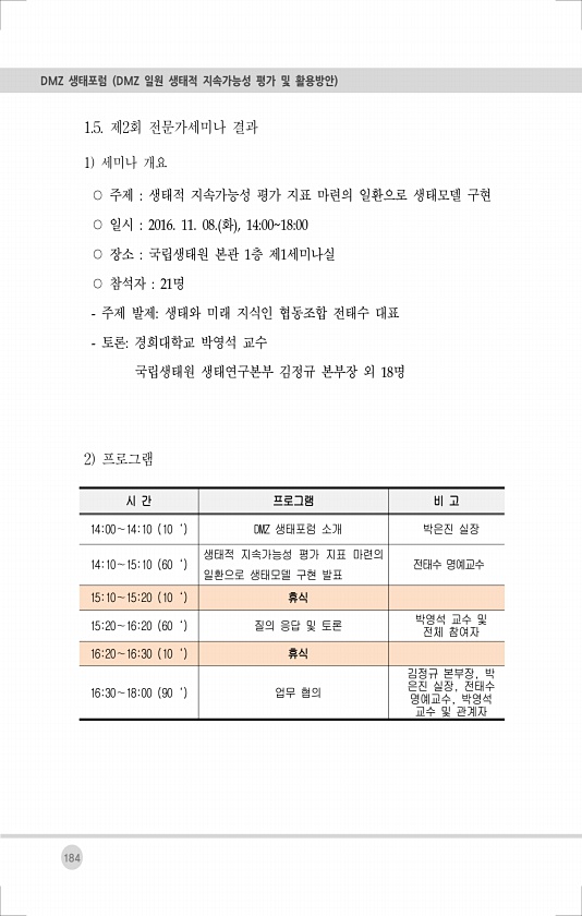 DMZ 생태포럼 DMZ 일원 생태적 지속가능성 평가 및 활용방안 184 1.5. 제2회 전문가세미나 결과 1 세미나 개요 ○ 주제 생태적 지속가능성 평가 지표 마련의 일환으로 생태모델 구현 ○ 일시 2016. 11. 08. 화 , 14001800 ○ 장소 국립생태원 본관 1층 제1세미나실 ○ 참석자 21명 주제 발제생태와 미래 지식인 협동조합 전태수 대표 토론경희대학교 박영석 교수 국립생태원 생태연구본부 김정규 본부장 외 18명 2 프로그램 시 간 프로그램 비 고 1400∼1410 10‘ DMZ 생태포럼 소개 박은진 실장 1410∼1510 60‘ 생태적 지속가능성 평가 지표 마련의 일환으로 생태모델 구현 발표 전태수 명예교수 1510∼1520 10‘ 휴식 1520∼1620 60‘ 질의 응답 및 토론 박영석 ...