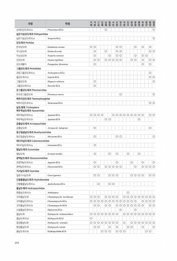 202 삼새민강도래 KUa Protonemura KUa ○ ○ 넓은가슴강도래과 Peltoperlidae 넓은가슴강도래 KUa Yoraperla KUa ○ 강도래과 Perlidae 한국강도래 Kamimuria coreana ○ ○ ○ ○ ○ ○ ○ 무늬강도래 Kiotina decorata ○ ○ ○ ○ ○ ○ 두눈강도래 Neoperla coreensis ○ ○ ○ ○ ○ ○ ○ 진강도래 Oyamia nigribasis ○ ○ ○ ○ ○ ○ ○ ○ ○ ○ ○ ○ 강도래붙이 Paragnetina favotincta ○ ○ ○ 그물강도래과 Perlodidae 큰등그물강도래 KUa Archynopteryx KUa ○ 줄강도래 KUa Isoperla KUa ○ ○ 그물강도래 Megarcys ochracea ○ ○ 그물...