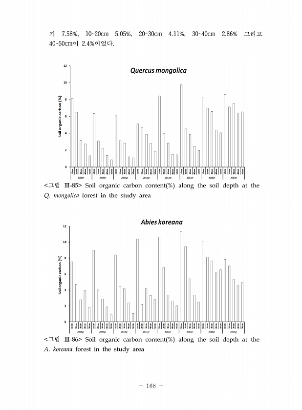 168 가 7.58%, 1020cm 5.05%, 2030cm 4.11%, 3040cm 2.86% 그리고 4050cm이 2.4%이었다. 그림 Ⅲ-85 Soil organic carbon content % along the soil depth at the Q. mongolica forest in the study area 그림 Ⅲ-86 Soil organic carbon content % along the soil depth at the A. koreana forest in the studyarea