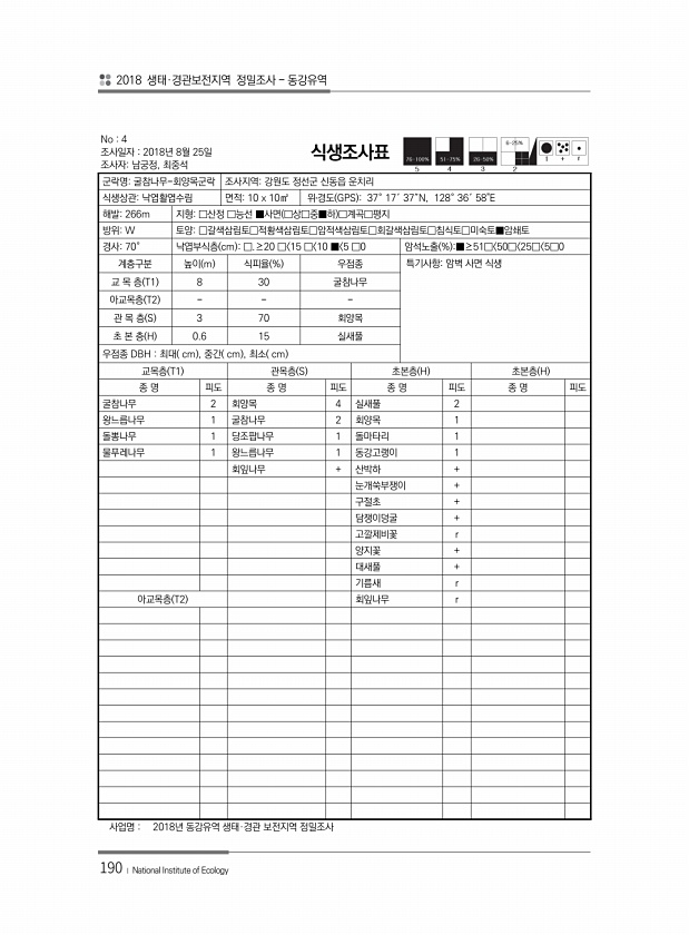 2018 생태·경관보전지역 정밀조사 동강유역 190 ? National Institute of Ecology No 4 조사일자 2018년 8월 25일 조사자남궁정, 최중석 식생조사표 군락명굴참나무-회양목군락 조사지역강원도 정선군 신동읍 운치리 식생상관낙엽활엽수림 면적10 x 10㎡ 위?경도 GPS 37° 17′ 37″N, 128° 36′ 58E 해발266m 지형□산정 □능선 ■사면 □상□중■하 □계곡□평지 방위W 토양□갈색삼림토□적황색삼림토□암적색삼림토□회갈색삼림토□침식토□미숙토■암쇄토 경사70° 낙엽부식층 cm □.≥20 □ 15 □ 10 ■ 5 □0 암석노출 % ■≥51□ 50□ 25□ 5□0 계층구분 높이 m 식피율 % 우점종 특기사항암벽 사면 식생 교 목 층 T1 8 30 굴참나무 아교목층 T2 관 ...