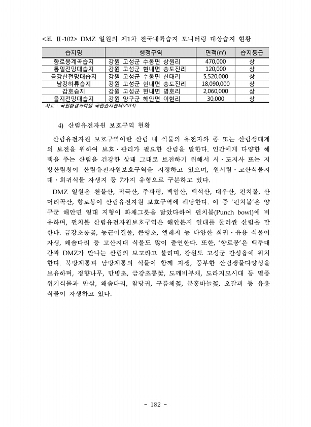 182 습지명 행정구역 면적 ㎡ 습지등급 향로봉계곡습지 강원 고성군 수동면 상원리 470,000 상 통일전망대습지 강원 고성군 현내면 송도진리 120,000 상 금강산전망대습지 강원 고성군 수동면 신대리 5,520,000 상 남강하류습지 강원 고성군 현내면 송도진리 18,090,000 상 감호습지 강원 고성군 현내면 명호리 2,060,000 상 을지전망대습지 강원 양구군 해안면 이현리 30,000 상 자료 국립환경과학원 국립습지센터 2014 표 일원의 제 차 전국내륙습지 모니터링 대상습지 현황 산림유전자원 보호구역 현황 산림유전자원 보호구역이란 산림 내 식물의 유전자와 종 또는 산림생태계 의 보전을 위하여 보호 관리가 필요한 산림을 말한다 인간에게 다양한 혜 택을 주는 산림을 건강한 상태 그대로 보전하기 위...