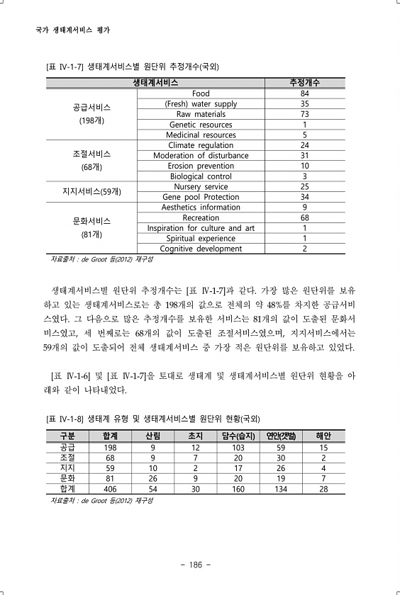 국가 생태계서비스 평가 186 생태계서비스 추정개수 공급서비스 198개 Food 84 Fresh water supply 35 Raw materials 73 Genetic resources 1 Medicinal resources 5 조절서비스 68개 Climate regulation 24 Moderation of disturbance 31 Erosion prevention 10 Biological control 3 지지서비스 59개 Nursery service 25 Gene pool Protection 34 문화서비스 81개 Aesthetics information 9 Recreation 68 Inspiration for culture and art 1 Spiritual experience 1 Cognitiv...