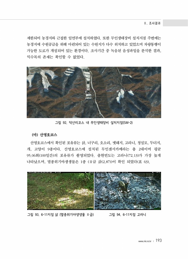 Ⅱ. 조사결과 www.nie.re.kr ? 193 제한되어 농경지와 근접한 임연부에 설치하였다. 또한 무인생태장비 설치지점 주변에는 농경지에 수원공급을 위해 마련되어 있는 수원지가 다수 위치하고 있었으며 차량통행이 가능한 도로가 개설되어 있는 환경이다. 조사기간 중 녹음된 음성파일을 분석한 결과, 익수목의 존재는 확인할 수 없었다. 그림 92. 덕산리코스 내 무인생태장비 설치지점 SM-2 마 산명호코스 산명호코스에서 확인된 포유류는 삵, 너구리, 오소리, 멧돼지, 고라니, 청설모, 두더지, 개, 고양이 9종이다. 산명호코스에 설치된 무인센서카메라는 총 2대이며 평균 95.06회 100일간 의 포유류가 촬영되었다. 출현빈도는 고라니 72.13 가 가장 높게 나타났으며, 멸종위기야생생물은 1종 Ⅱ급 삵 2.87...